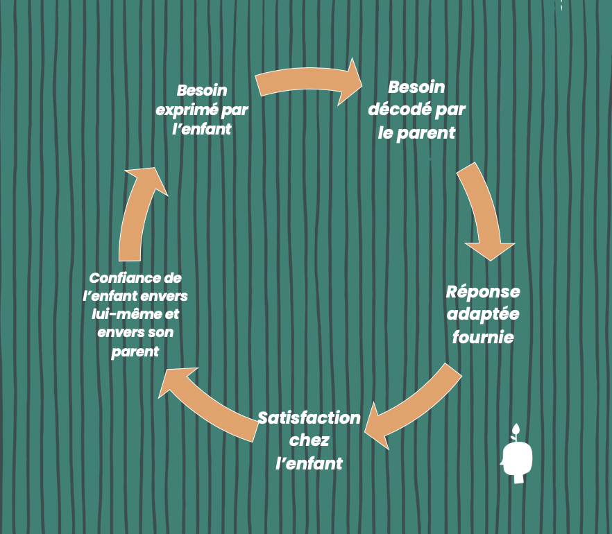 Le rôle du parent est donc crucial dans les premiers mois de l’enfant afin que ce dernier puisse intérioriser une confiance en lui-même (en ses capacités à exprimer ses besoins et à obtenir une réponse satisfaisante) ainsi qu’une confiance aux autres. Cette confiance se construira au gré des réponses des parents vis-à-vis les besoins de l’enfant. Le parent doit savoir détecter le besoin de l’enfant afin d’y répondre de manière adéquate: au bon moment et avec chaleur et affection. Par exemple, si un bébé pleure, que le parent pense qu’il a besoin de dormir alors le couche dans son lit et que bébé continue de pleurer, peut-être que le parent n’a pas su décoder adéquatement le besoin. Le fait de le laisser pleurer pour qu’il s’endorme traduira ainsi une réponse inadéquate puisqu’elle ne répond pas au besoin précis du bébé. Si, par exemple, bébé a froid et que le parent détecte ce besoin après de longues minutes de pleurs, même si le bébé a finalement été enveloppé dans une couverture chaude, la réponse n’est pas adaptée puisqu’elle n’a pas été effectuée au bon moment. Autre exemple: bébé a besoin d’attention et montre de l’intérêt pour un petit jouet. Le parent donne immédiatement le jouet au bébé, donc la réponse est fournie au bon moment, mais pendant que le bébé explore le jouet, le parent regarde son téléphone et n’interagit pas avec son bébé. Ce dernier avait aussi besoin d’attention et de soutien dans son activité d’exploration, alors la réponse fournie par le parent n’est pas faite avec chaleur et affection.