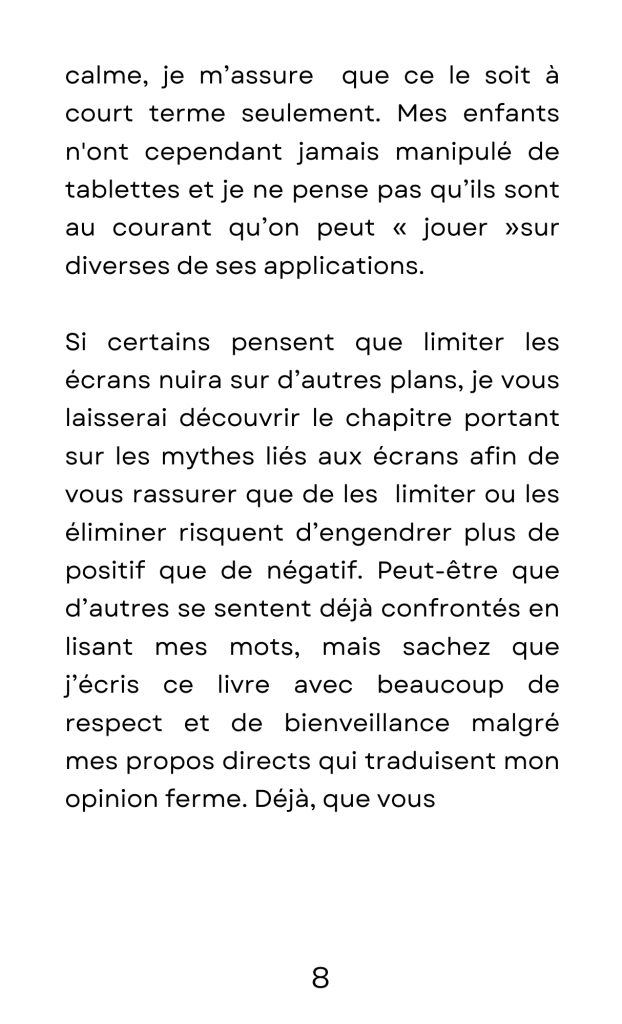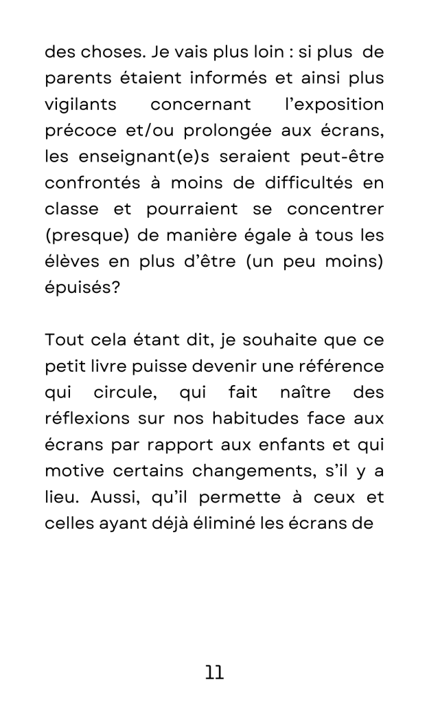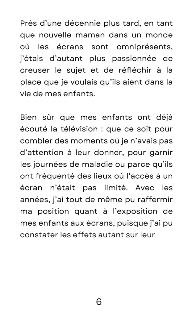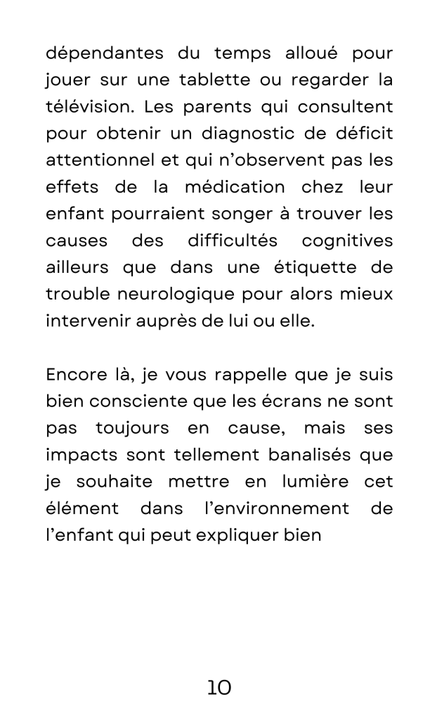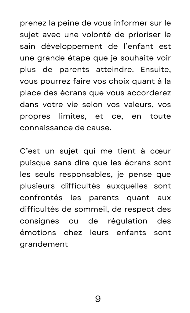 J’ai rédigé chaque mot en me mettant à la place de quelqu’un qui souhaite reconnaitre l’ampleur des effets du temps d’écran, souvent déformés par le besoin de se déculpabiliser. Je souhaite d’ailleurs aider un parent à faire la part des choses quand certaines situations incitent à avoir recours au temps d’écran et que ce n’est pas nécessaire de s’en vouloir, versus un sentiment face à une habitude qui s’installe pouvant agir comme moteur de changement.