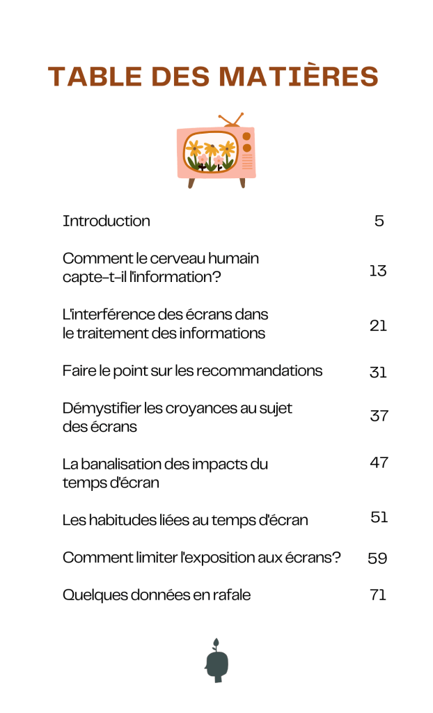 Divisé en 9 chapitres, vous comprendrez mieux comment le cerveau humain fonctionne et en quoi les écrans sont nocifs, surtout chez les enfants qui développent des structures essentielles à leur bon fonctionnement cognitif.