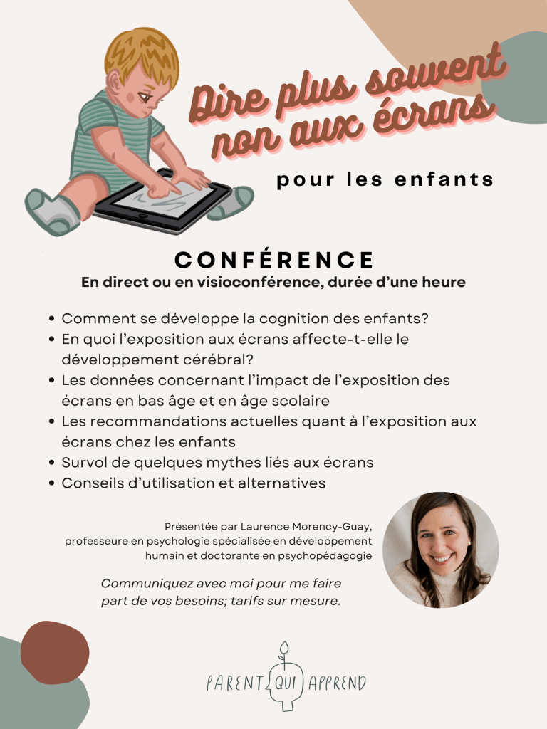 J’ai rédigé chaque mot en me mettant à la place de quelqu’un qui souhaite reconnaitre l’ampleur des effets du temps d’écran, souvent déformés par le besoin de se déculpabiliser. Je souhaite d’ailleurs aider un parent à faire la part des choses quand certaines situations incitent à avoir recours au temps d’écran et que ce n’est pas nécessaire de s’en vouloir, versus un sentiment face à une habitude qui s’installe pouvant agir comme moteur de changement.
