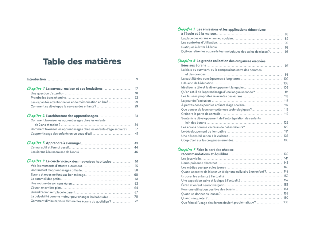 Divisé en 9 chapitres, vous comprendrez mieux comment le cerveau humain fonctionne et en quoi les écrans sont nocifs, surtout chez les enfants qui développent des structures essentielles à leur bon fonctionnement cognitif.